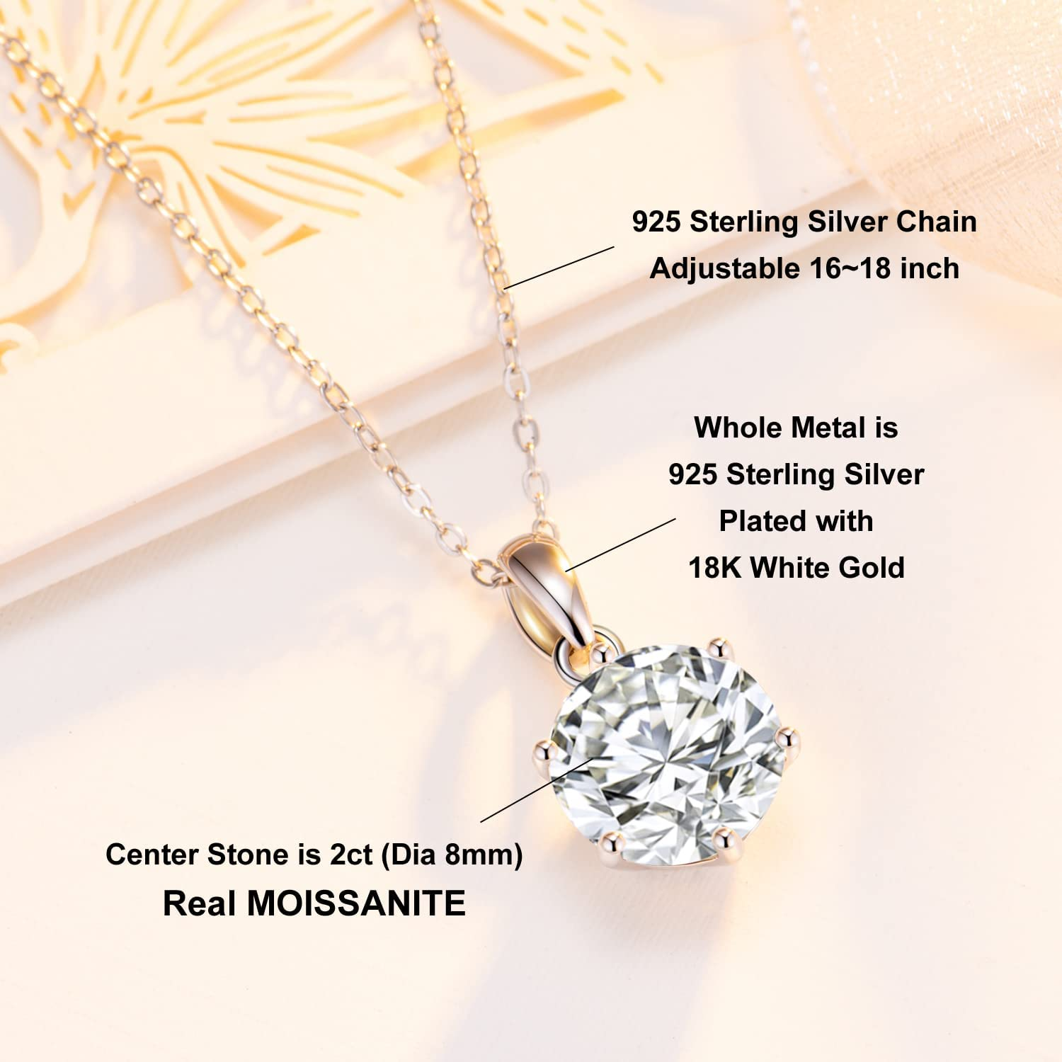 2CT Moissanite Pendant Necklace 18K White Gold Plated Silver D Color Ideal Cut Diamond Necklace for Women with Certificate of Authenticity