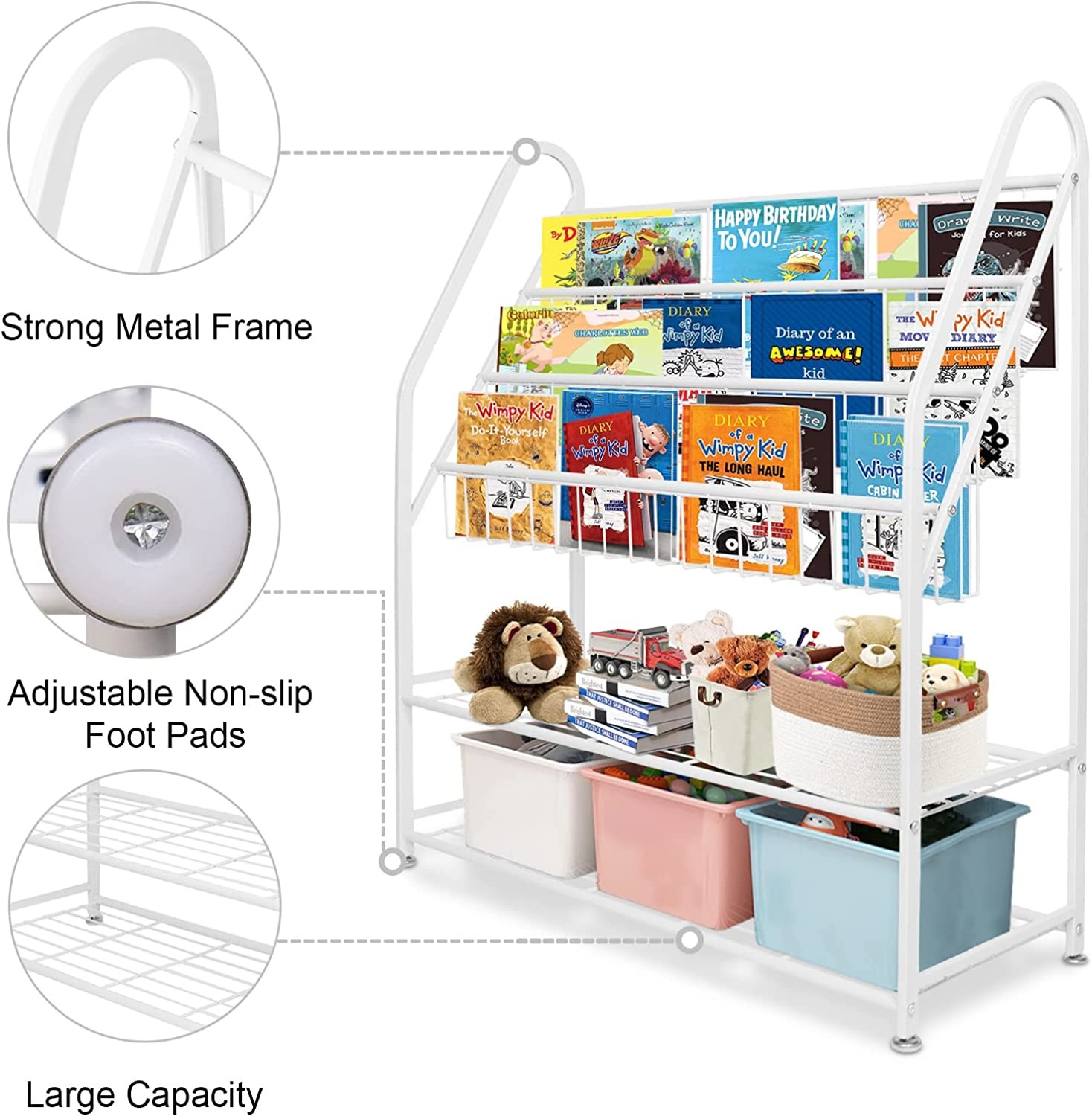 • ✔ EXCELLENT MANUFACTURING TECHNOLOGY: The children's bookcase is made of metal material, which is durable and heavy-duty. Featuring a curved design, the entire bookcase is fully polished. The curved design prevents children from getting hurt when using the bookcase. The fully polished surface prevents the bookcase from rusting and is easy to clean.