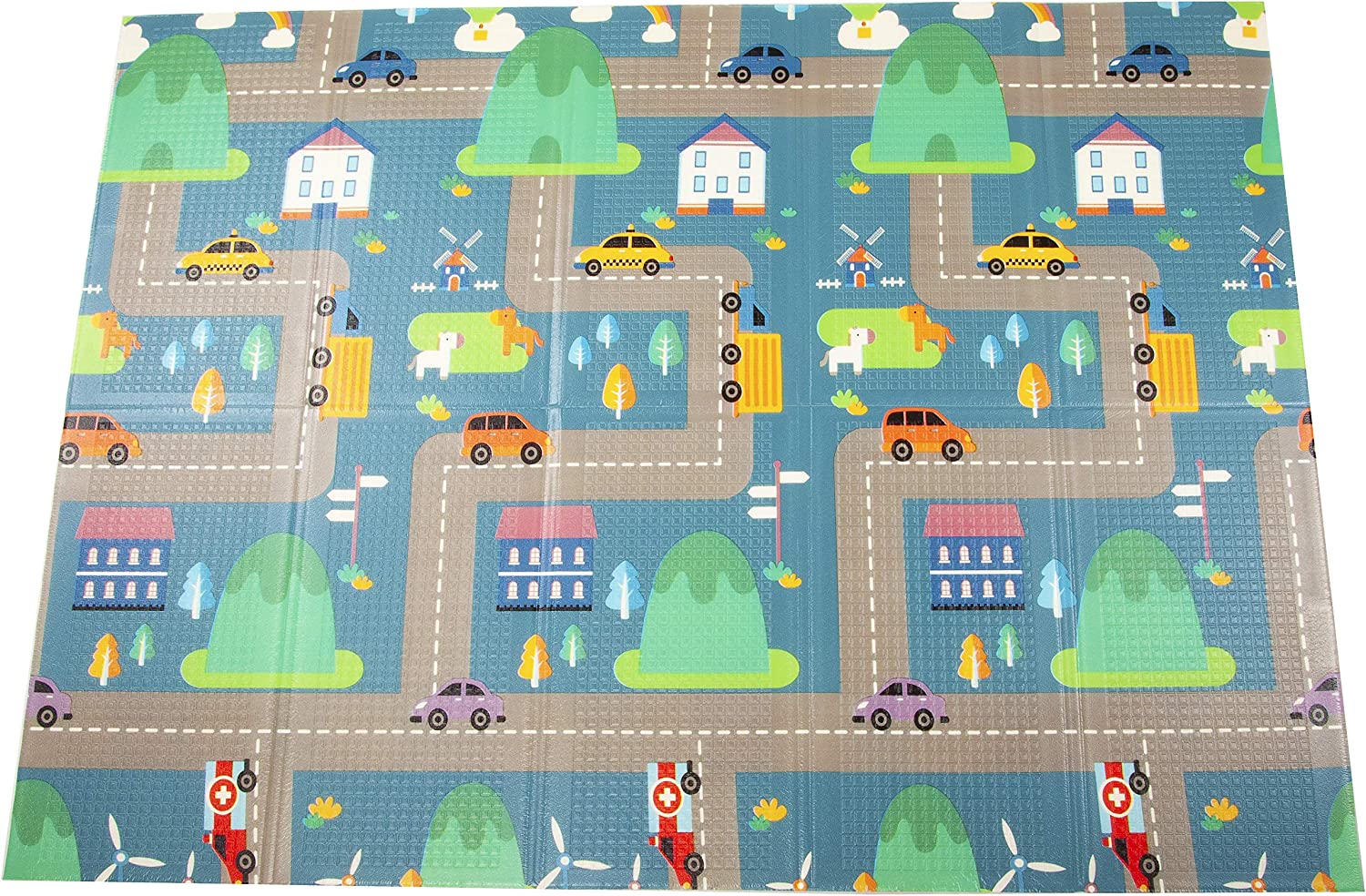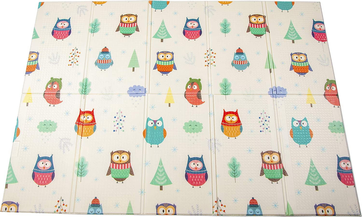 Double-sided design. Comes with two versions: Animals+Letters and Owls+Cities. Bright color and teaches basic recognition. Full dimensions: 58-inch x 77-inch, 0. 33-inch thick. Folding dimensions: 15. 4-inch x 28. 9-inch, 3. 74-inch thick