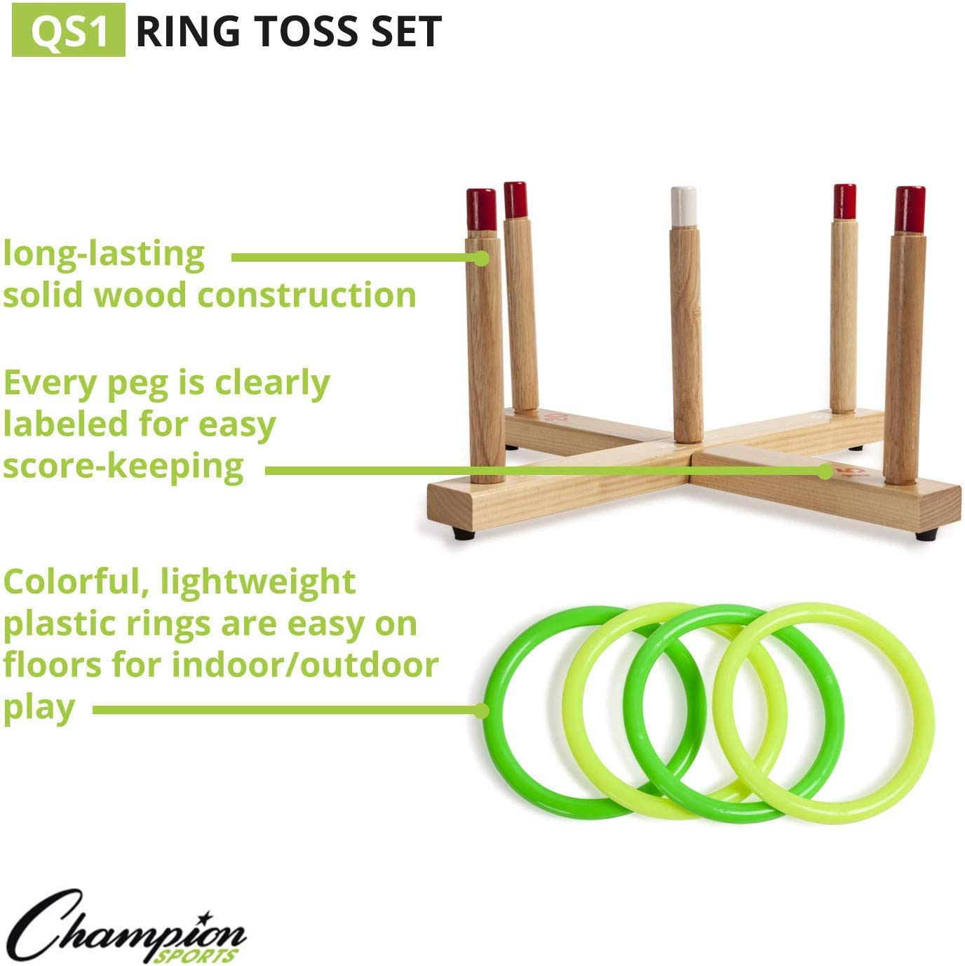 BRIGHT, VIBRANT DESIGN: With durable bright plastic rings with plastic connectors and scoring pegs on the wooden base, this ring toss set is designed for maximum visibility Large numbers on the base also make it easy to keep score and aim