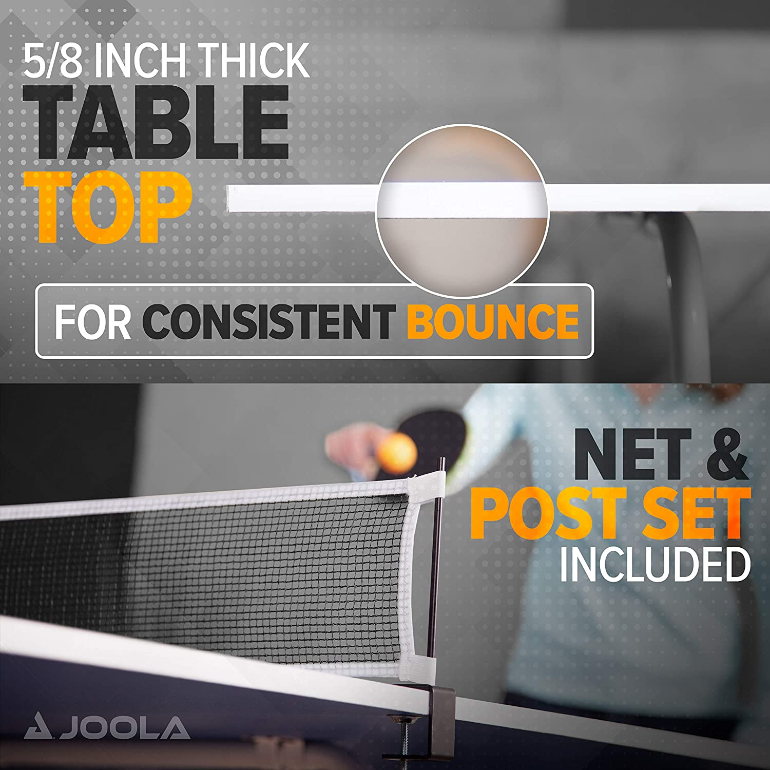 • 15MM TABLE TENNIS TOP PLAYING SURFACE: Durable 5/8 inch (15mm) thick ping pong table top for reliable ball bounce. For improved performance, it is recommend to use JOOLA ping pong paddles and ping pong balls (not included).