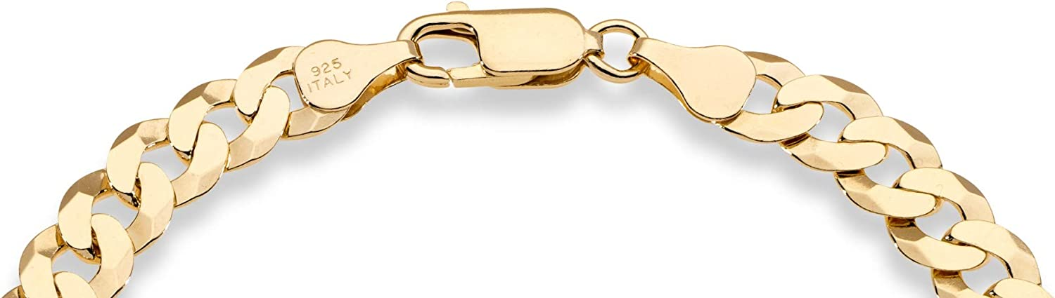 • MODERN CLASSIC - Add style to a basic look with this solid 18K yellow gold over sterling silver 7mm Curb bracelet. Our flat diamond-cut beveled links are much more reflective than the standard Curb chain for a rich, perfect shine. Strong and durable for daily wear yet not too thick for a comfortable fit. A chain that gives modern elegance to both casual and formal outfits, wear it solo for an everyday polished look or stack with other bracelets for a cool fashion statement.