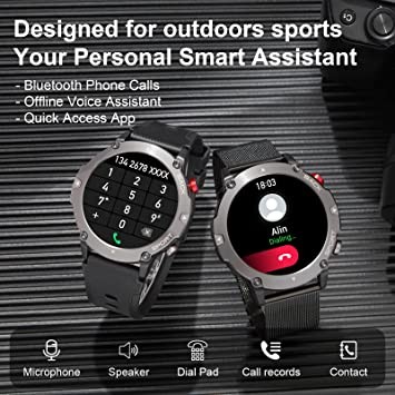 • BLUETOOTH DIALING & BUILT IN SPEAKER: Avxtc tactical smart watch supports Bluetooth dial and answer calls. You can directly make calls and answer calls on your watch. Get free from your phone especially when you are driving, or jogging, etc.Built in speaker, Avxtc mens smart watch can not only control the phone music playing, but also play the music itself. Besides, Avxtc also supports calorie/ distance calculation, weather forecast, message notifications etc.